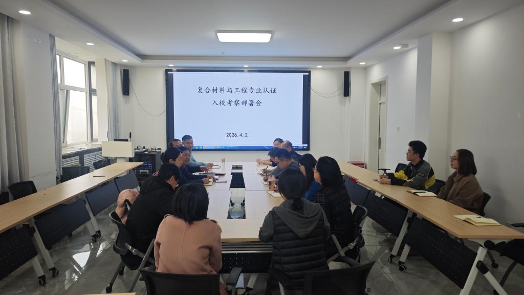 2026年4月2日下午于慎思楼308会议室召开复合材料与工程专业认证入校考察部署会。教务处副处长张永进,学院党委书记张奎勤、院长黄林军及专业认证工作组成员、各专项组负责人、骨干教师参会。